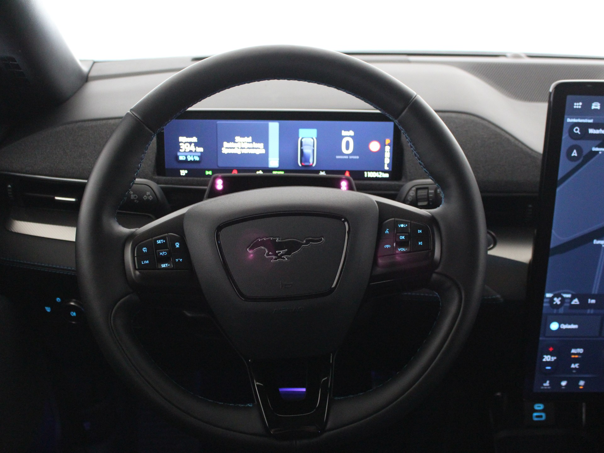 Zoals u mag verwachten van deze Ford Mustang Mach-E is hij uitgerust met een reeks aan actieve veiligheidssystemen. De actuele snelheidslimiet, een inhaalverbod en andere verkeersborden; de verkeersborddetectie ondersteunt u tijdens elke rit. Het Lane-keeping systeem garandeert dat u zich niet onverhoeds buiten de lijnen van de rijstrook begeeft. Op een kop-staartbotsing zit niemand te wachten. Daarom is de forward collision warning onderweg constant alert en berekent via een sensor de veilige afstand tot voorliggers. De veiligheid van deze auto wordt verder verhoogd door dodehoekdetectie, vermoeidheidsherkenning, autonoom remsysteem en bandenspanningcontrolesysteem.